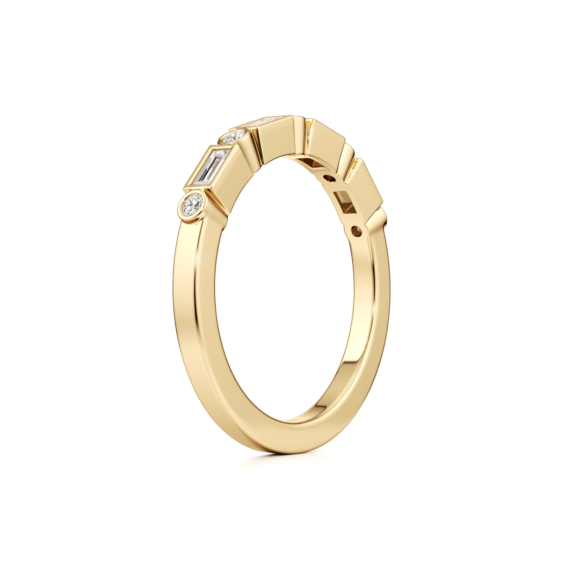 טבעת עדינה עשויה זהב 14K ומשובצת יהלומים עגולים ויהלומים בחיתוך ״בגט״ בשיבוץ ״בזל״ במשקל כולל של 0.20 קראט.