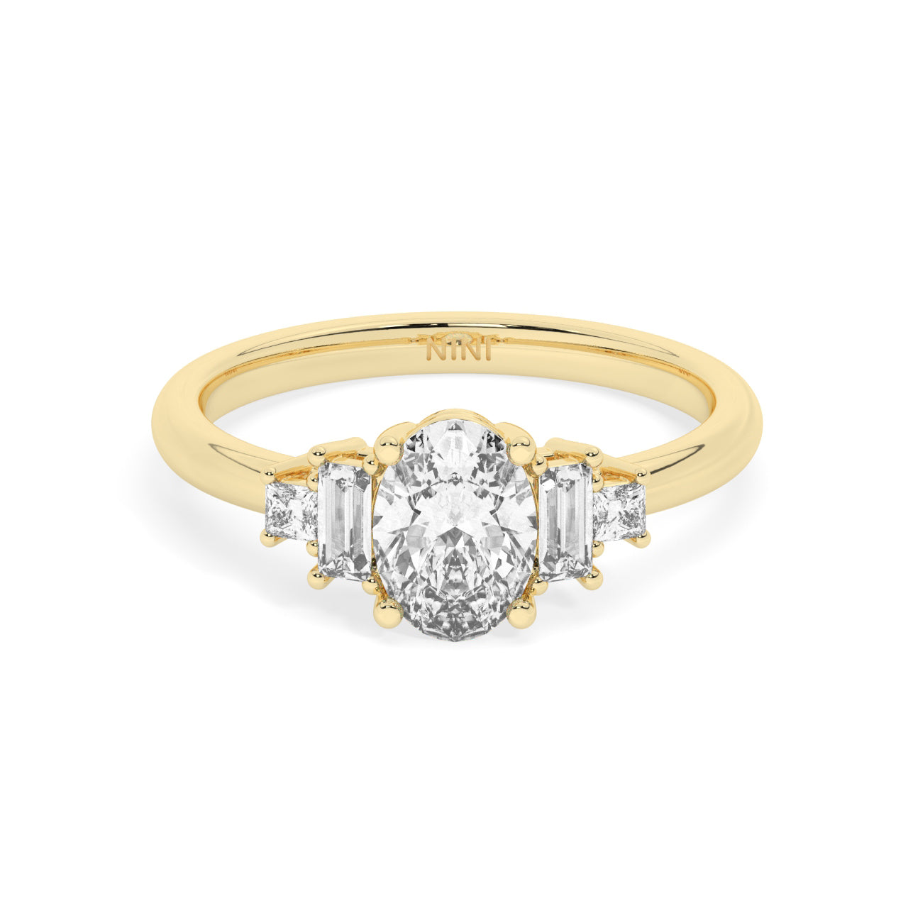 1.00 Carat Oval cut diamond engagement ring, the center stone is decorated with baguette cut and princess cut diamonds.