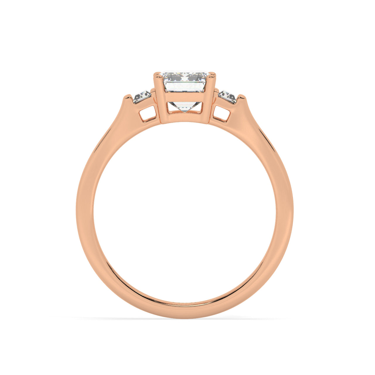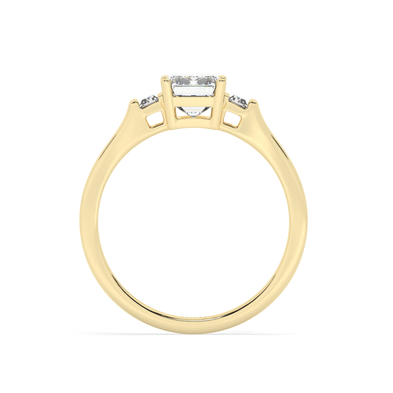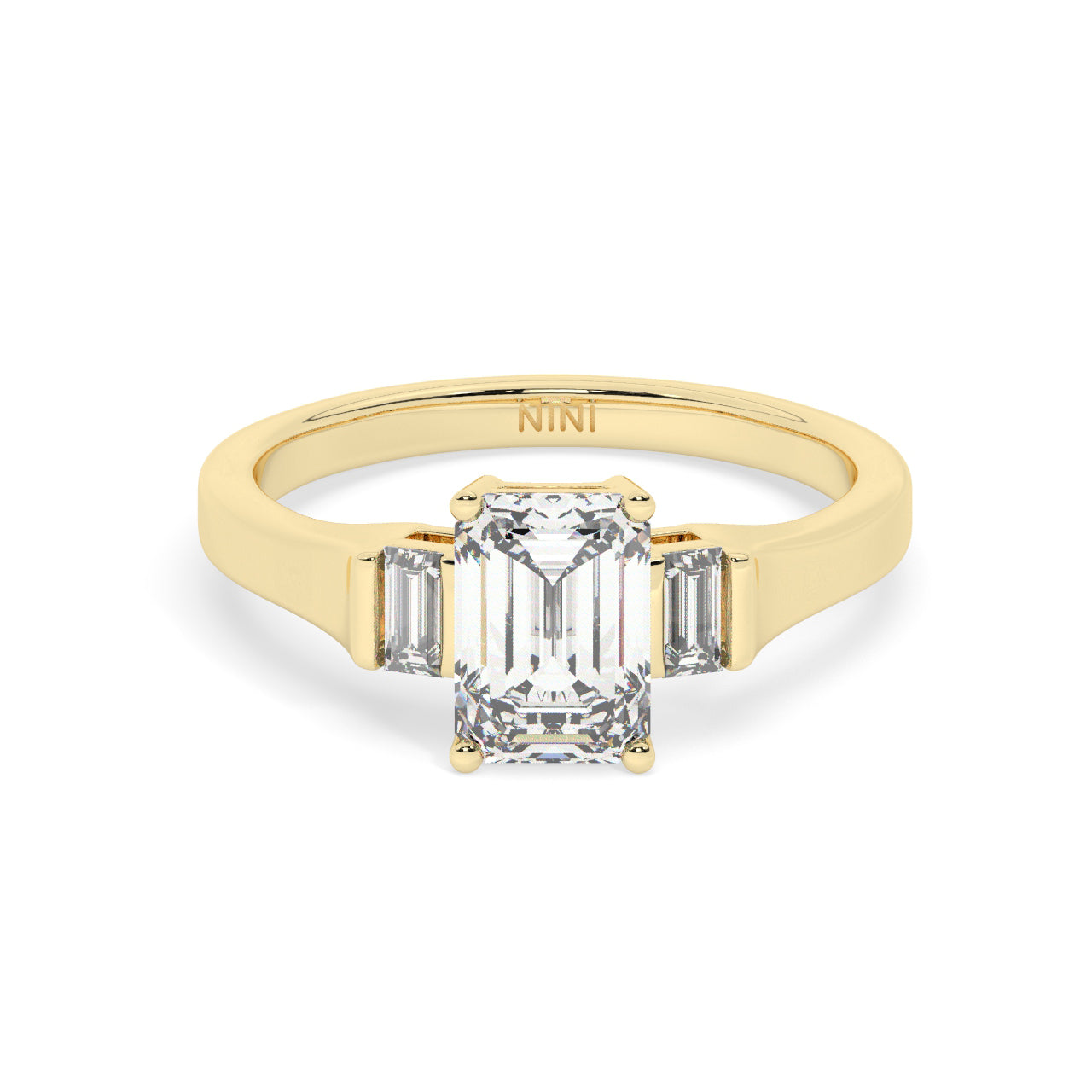 Unique 14K gold engagement ring, set with 1.50 Carat Emerald cut diamond set with two Baguette cut diamonds.