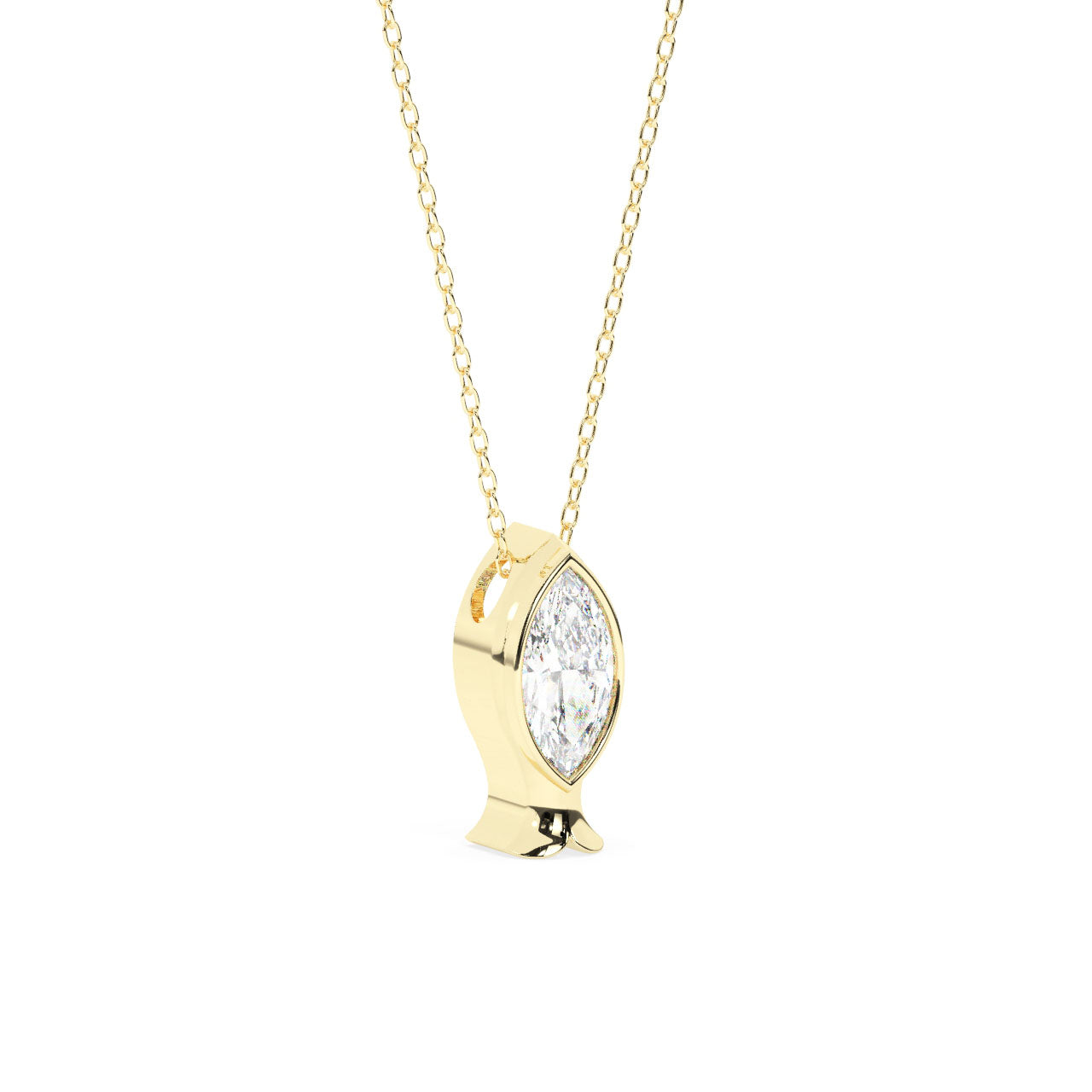 14K Gold Fish Necklace set with a 1.00 Ct Marquise cut Diamond.