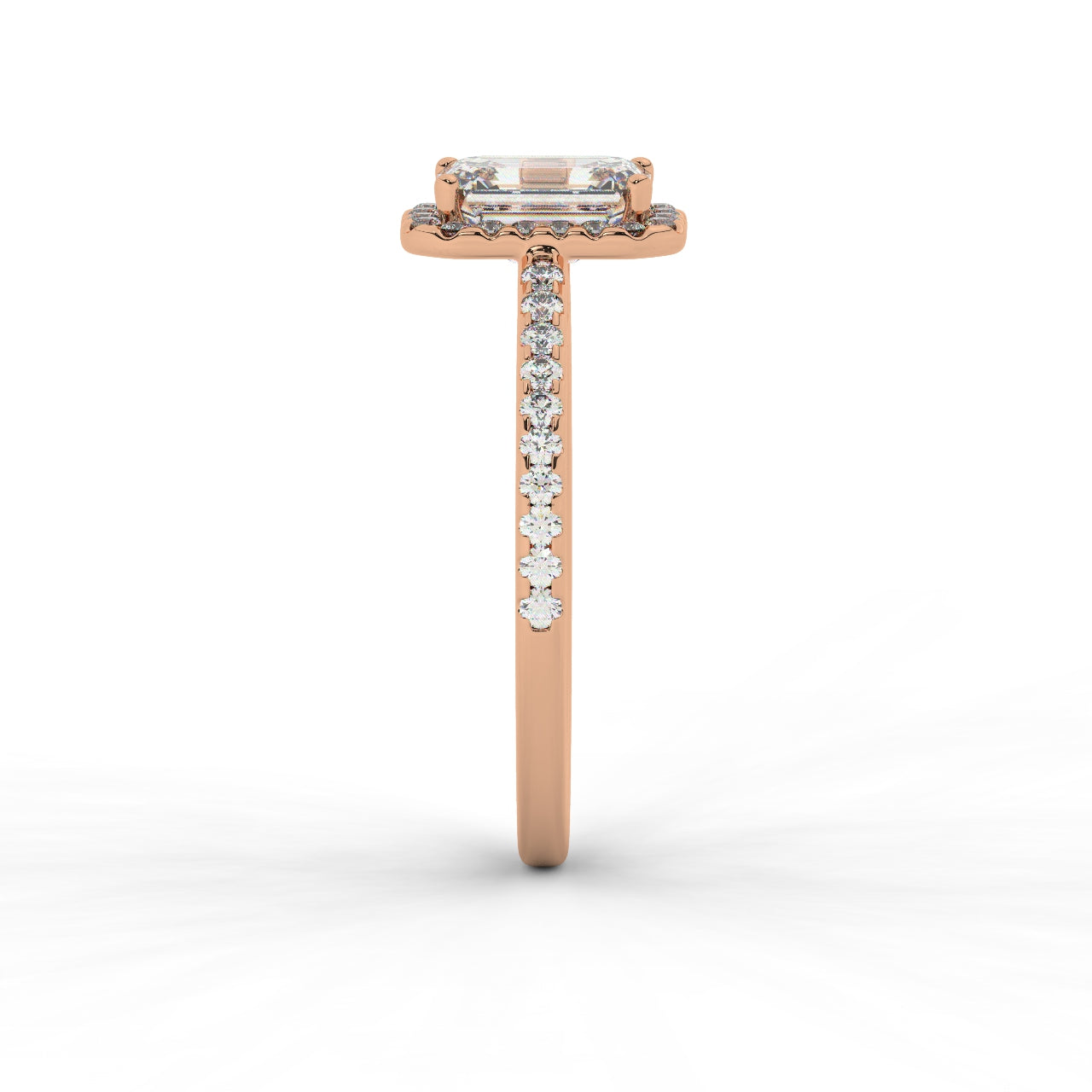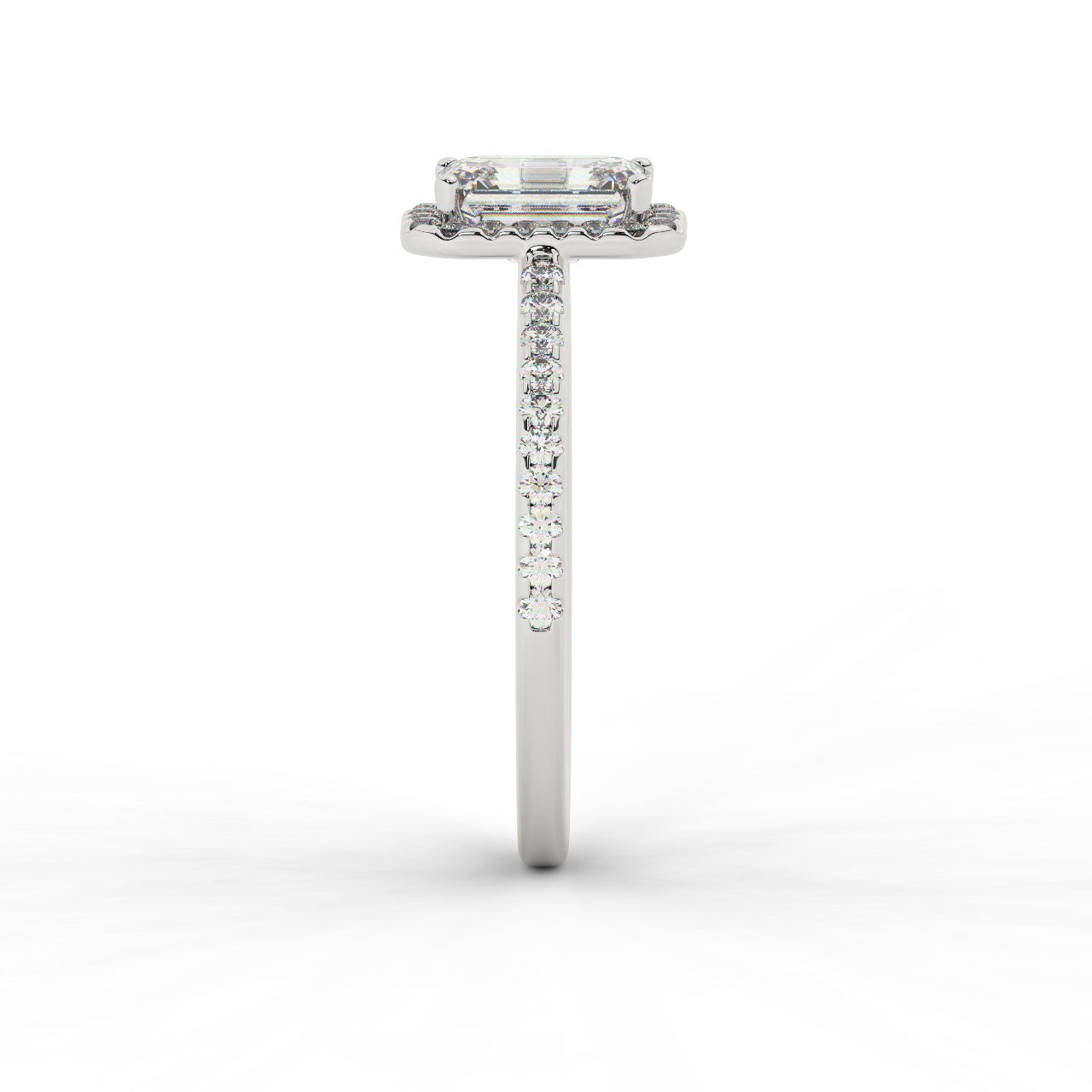 1.50 Carat Emerald cut diamond engagement ring with diamonds halo around the main diamond, and diamonds on the band.