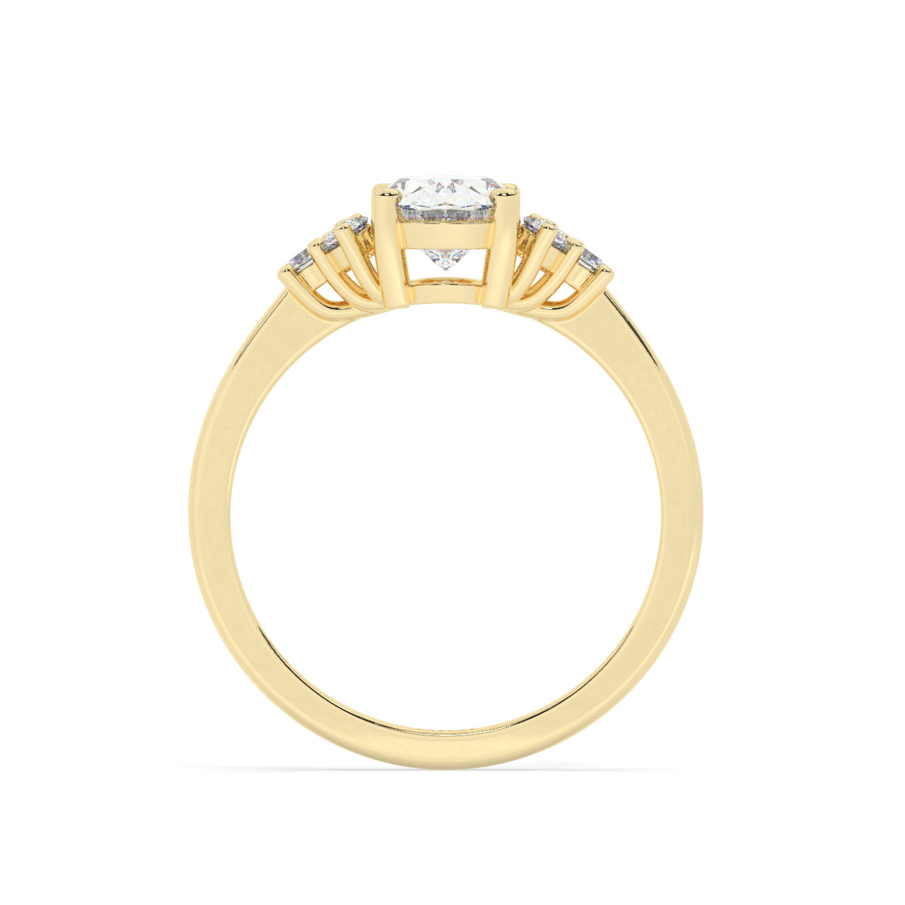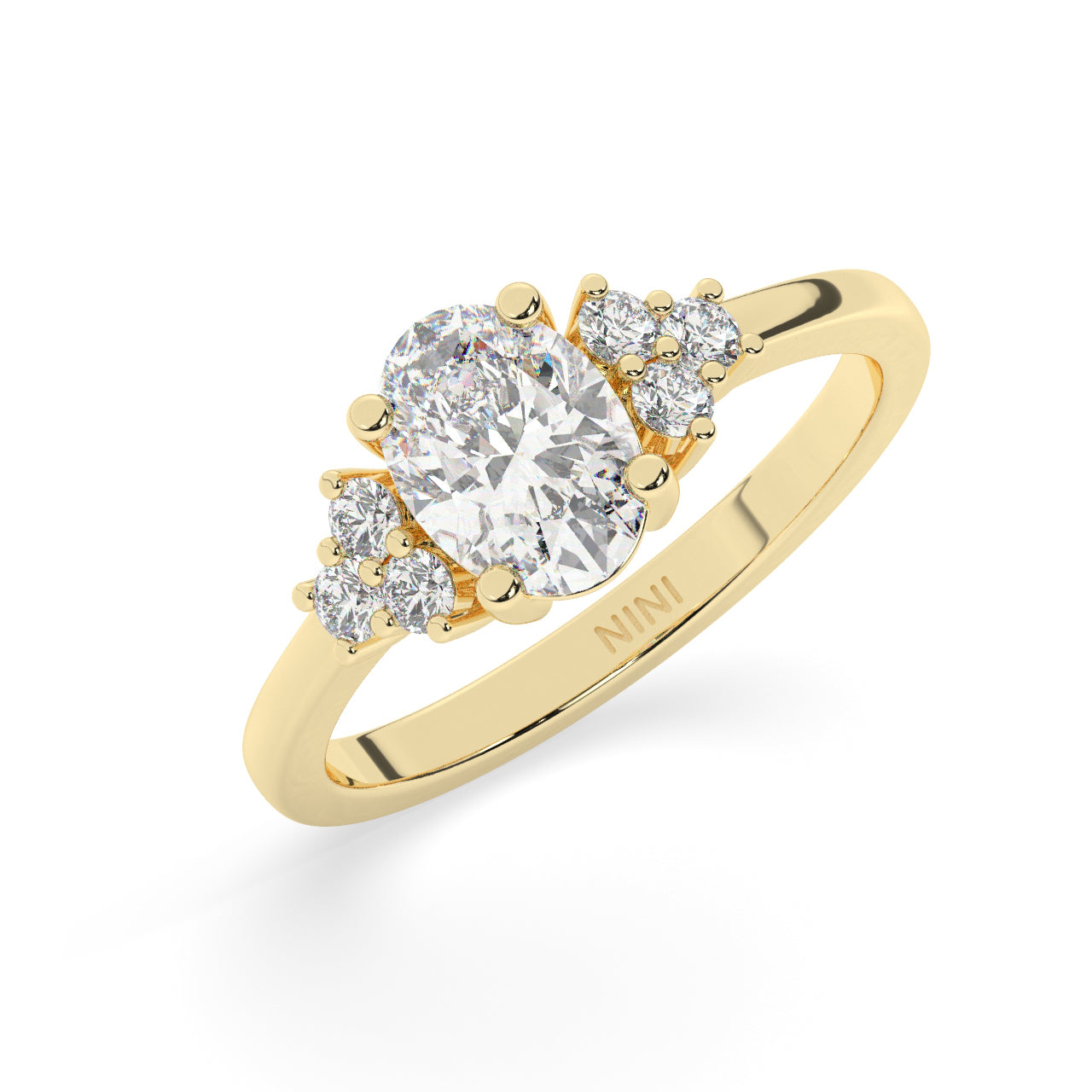 1.00 Carat Oval cut diamond engagement ring, the center stone is decorated with three round cut diamonds on each side.